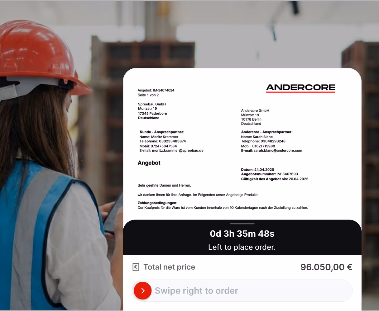 Andercore runs the full order process in one guided flow. Our AI system structures requests, finds the right supply, coordinates logistics and financing, and manages delivery and reordering across the entire physical chain.